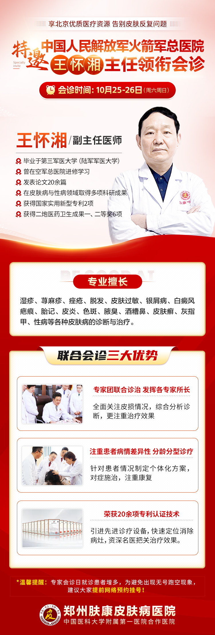 10月25-26日,北京名医王怀湘主任赴郑州肤康皮肤病医院亲诊,网上预约方便快捷,提前预约可免去您到院挂号和排队等候的烦恼,注意每天仅限20名。